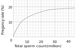 Approximate pregnancy rate as a function of العدد الكامل للحيوانات المنوية (may be twice as large as العدد الكامل للحيوانات المنوية المتحركة). Values are for intrauterine insemination. (Old data, rates are likely higher today)
