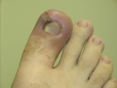 Infected ingrown toenail showing the characteristic redness and swelling associated with acute inflammation