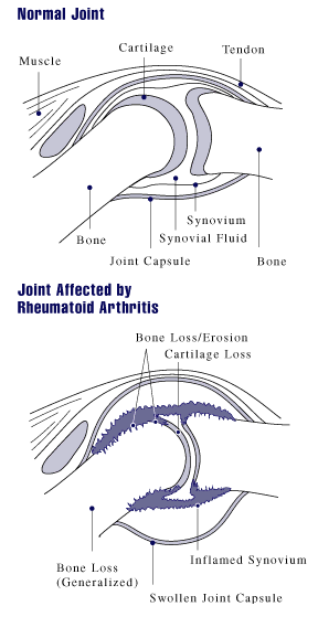 رسم يوضح تاثير التهاب المفاصل الرثياتي على الأغشية المبطنة للمفاصل | |