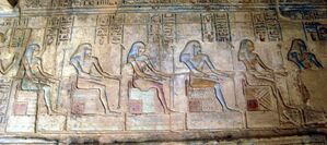 - ^ "Drawn by Faucher-Gudin from a photograph by Béato. C.f. Lepsius, Denkm, iv.pl.66 c.", published in Maspero (1897). The scene is collapsed from "the two extremities of a great scene at Philae, in which the Eight, divided into two groups of four, take part in the adoration of the king."