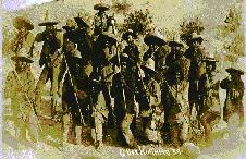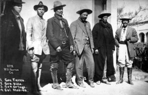 الجنرال فرانسيسكو "پانچو ڤيا" مع أركانه في 1913. ڤيا يرتدي بذة رمادية في الوسط، ومساعد ڤيا، الجنرال رودولفو فييرو إلى يمين پانچو ڤيا.