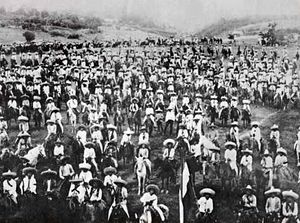 Leaders of the 1910 revolt pose for a photo after the First Battle of Juárez. Present are José María Pino Suárez, Venustiano Carranza, Francisco I. Madero (and his father), Pascual Orozco, Pancho Villa, Gustavo Madero, Raul Madero, Abraham González, and Giuseppe Garibaldi Jr.