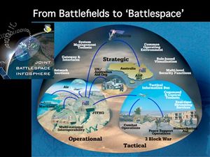 بارتباطها الخاص المعلومات المعاصرة، الاتصالات وتكنولوجيا الفضاء، فالثورة في الشؤون العسكرية ترتبط بالنقاشات الجارية تحت اسم التحول وإجمالي نظام التكامل بالجيش الأمريكي.