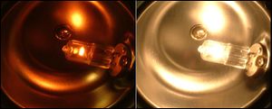 توضيح قانون بلانك،المصباح البارد يُصدر ضوءا أحمرا، والمصباح الساخن يـصدر ضوءا أبيض.