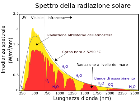 يبين الشكل المقابل (الإيطالي) طيف الشمس الذي التقطه أحد الأقمار الصناعية (باللون الأصفر)وهو ينطبق انطباقا جيدا على منحني بلانك من أول الطيف إلى آخره، وكلاهما يبين قمة للإشعاع بين موجة طولها 750 نانومتر ونحو 370 نانومتر، وهذا هو حيز الضوء المرئي. وتجري المقارنة في نفس الوقت بطيف الشمس الملتقط على سطح الأرض (باللون الأحمر)، ولايزال التطابق جيدا بينهم مع الفارق أن طيف الأرض يتعرض عند بعض أطوال موجة أشعته للامتصاص في جو الأرض، الشيئ الذي يترك فيه بعض الفجوات وهي ناشئة في معظمها عن امتصاص بخار الجو لتلك الأشعة. كما نلاحظ أن الطيف الحراري للشمس ينتهي تقريبا عند طول موجة قدرها نحو 170 نانومنتر وهو تقريبا نهاية الأشعة التحت بنفسجية.