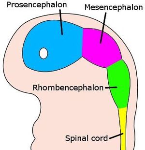 The neural tube gives rise to both brain and spinal cord. The anterior (or 'rostral') portion of the neural tube initially differentiates into three brain vesicles (pockets): the prosencephalon at the front, the mesencephalon, and, between the mesencephalon and the spinal cord, the rhombencephalon. (By six weeks in the human embryo) the prosencephalon then divides further into the telencephalon and diencephalon; and the rhombencephalon divides into the metencephalon and myelencephalon. The spinal cord is derived from the posterior or 'caudal' portion of the neural tube.