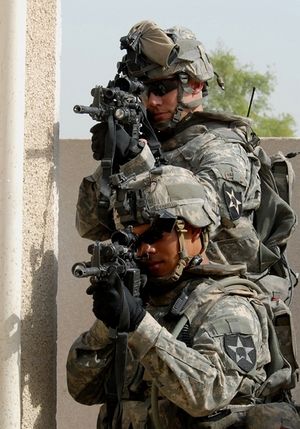 Capt. J. Dow Covey and Staff Sgt. Justin Evaristo, both assigned to 4th Stryker Brigade Combat Team, 2nd Infantry Division, move around the corner of a building to secure its perimeter for the Mobile Civil Military Operations Center in Mushahidah, Iraq
