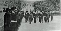 Fire-department personnel wearing the German dunkelblau uniform, and a variant of the fez which resembles the German Pickelhaube