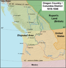 An 1844 boundary dispute during the Presidency of James K. Polk led to a call for the northern boundary of the U.S. west of the Rockies to be 54°40′N related to the southern boundary of Russia's Alaska Territory. However, Great Britain wanted a border that followed the Columbia River to the Pacific Ocean. The dispute was resolved in the Oregon Treaty of 1846, which established the 49th parallel as the boundary through the Rockies.[5][6]