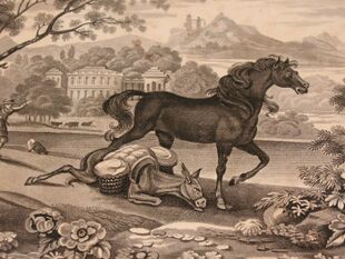 The fable does not appear in William Caxton's collection of Aesop's Fables although it does in later English compilations. La Fontaine's Fables further popularised the story as "The Horse and the Ass".[4] This begins with the moral that, in Classical versions, is usually put into the mouth of the remaining animal: