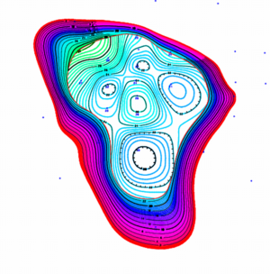 Screenshot of an Isopach map generated by reservoir modeling software for an 8500 ft deep oil reservoir 28 ft thick located in the Erath field, Vermilion Parish, Erath, Louisiana. The contour interval is 2 ft between successive contour lines. Because oil floats above water, the outer red color indicates the elevation of the water/oil contact zone, which is at the bottom of the Petroleum reservoir. Inside the dark blue color is a thin red contour line which indicates the top of the oil reservoir, 22 feet above the water/oil zone. Because gas floats above oil, the thin red contour line marks the gas/oil contact zone. The five smallest circles inside the image indicate slight depressions along the roof, or oil/gas zone of the reservoir. Oil drilling to this petroleum reservoir could use Directional drilling to accurately target the 28 ft thick space, 8,500 ft underground.