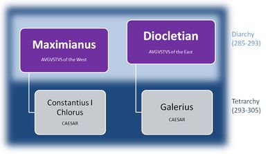 في عهد ديوكلتيانوس، بدأ الإنقسام السياسي في الإمبراطورية الرومانية. في عام 286 بإنشاء حكومة رباعية أعطى الجزء الغربي لمكسيميانوس بلقب أوغسطس و سَـمـّى كونستانتيوس كلوروس كمرؤوسه (قيصر). قسـّم هذا النظام الإمبراطورية بفعالية إلى أربعة أجزاء منفصلة وأوجد عواصم أخرى إلى جانب روما كوسيلة لتجنب الإضطرابات الأهلية التي ميزت القرن الثالث. في الغرب كانت العواصم مدينة مكسيميانوس "ميديولانوم" (ميلانو الحالية) و مدينة كونستانتيوس "ترير". في 1 مايو 305 أُزيح الأغسطسيون من مناصبهم وحل محلهم القياصرة.