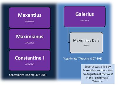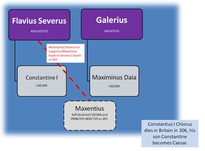After the death of Constantius his legions proclamate his son Constantin to be the new Augustus, but Galerius elevates Severus to be the new junior Augustus and compensates Constantin with the grade of Caesar'.