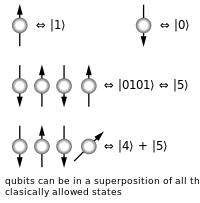 لفهم هذه النقطة بشكل أفضل ، ضع في اعتبارك كمبيوترًا كلاسيكيًا يعمل على امسجل ثلاثة بت . إذا كانت الحالة المحددة للسجل في وقت معين غير معروفة ، فيمكن وصفها على أنها توزيع الاحتمالات على السلاسل المختلفة الثلاثة <بت> 000 ، 001 ، 010 و 011 و 100 و 101 و 110 و و 111 . إذا لم تكن هناك حالة عدم يقين بشأن حالتها ، فستكون في واحدة من هذه الحالات تمامًا مع الاحتمال 1. ومع ذلك ، إذا كان كمبيوتر احتمالي ، فعندئذ تكون هناك إمكانية لوجودها في أي " "واحد" لعدد من الحالات المختلفة. وبالمثل ، يتم وصف حالة الكمبيوتر الكمومي بمقدار ثلاثة كيلو بايت بواسطة ناقل الاتجاه الثنائي الأبعاد (أو متجه واحد الأبعاد مع كل عقدة متجه تحمل السعة والحالة كسلسلة بت من وحدات البت). هنا ، ومع ذلك ، فإن المعاملات هي رقم عقدي مركب ، وهي مجموع "المربعات" للمعاملات " القيم المطلقة, , والتي يجب أن تساوي 1.لكل , القيمة المطلقة المربعة يعطي احتمال وجود النظام في -th الحالة بعد القياس. ومع ذلك ، نظرًا لأن الرقم المركب لا يشفر فقط الحجم ولكن أيضًا الاتجاه في المستوى المركب ، يمثل فرق الطور بين أي معاملتين (حالات) بارامتر ذو معنى. هذا هو الفرق الأساسي بين الحوسبة الكمومية والحوسبة الكلاسيكية الاحتمالية.[5]