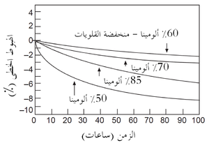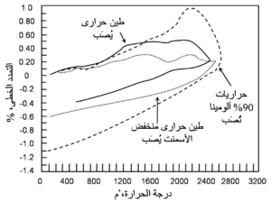يوضح شكل 14 خصائص التمدد الحرارى الحاصل لعدد من الحراريات المترابطة بالأسمنت خلال التسخين الصاعد الأولى، حيث تظهر هذه المواد انكماشاً على مدى درجة حرارة بين 205-315 ْم، الذى يصاحب التحلل الحرارى للأسمنت، ويتحدد مقدار الانكماش بجودة وكمية الأسمنت، وفى درجات الحرارة فوق 980 حتى 1090 ْم يحدث انكماش إضافى نتيجة للتَلَبُّد. والتمدد الحرارى الأساسى يُعَيَّن بخصائص الرُكَام المستخدم. الانكماشات التى تحدث أثناء التسخين الصاعد الأولى حتى 1430 ْم هى انكماشات دائمة بطبيعتها، ومقدارها عادة بين 0,2 إلى 1,5٪.