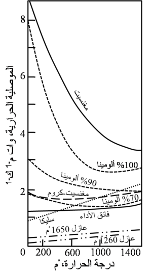 كعوازل، استخدمت المواد الحرارية دائما لحفظ الحرارة، ومقاومتها لسريان الحرارة هو عامل اختيار رئيسى في كثير من التطبيقات. يبين شكل 16 منحنيات الموصلية الحرارية لأنواع حرارية عديدة تتراوح بين الحراريات الكثيفة والطوب العازل. بعض الحراريات مثل الكربون أو كربيد السليكون لديها موصليات حرارية عالية بصورة ملموسة (تصل إلى 43,26 وات م-1 ك-1) في حين أن مواد أخرى لديها موصليات حرارية أقل من 0,14 وات م-1 ك-1، مثل كتل العزل أو الألياف الحرارية.