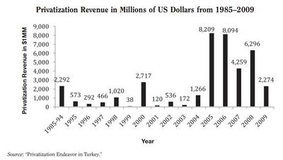 منذ عام 1985 تم خصخصة أسهم الدولة في 188 شركة مملوكة للدولة. كانت أولى محاولات الخصخصة في تركيا هي بيع تلتاس عام 1988. تم بيع تلتاس، شركة الاتصالات عالية الربحية، عن طريق طرح عام بسعر محدد في بورصة إسطنبول. أثناء عملية الخصخصة، تم بيع 22% من المؤسسة للعامة. من 1991 حتى 1997 تم خصخصة القطاعات الرائدة في تركيا مثل صناعة الاسمنت، الحديد والصلب، المطارات والخدمات البرية، إطارات الطائرات، البنوك الحكومية، وشركات الكهرباء والطاقة. في معظم الحالات، كانت ملكية الدولة في تلك المؤسسات أقل من 50%؛ وعند خصخصتها يتم نقل الملكية بالكامل للشركات الخاصة أو بيعها عن طريق بورصة إسطنبول.