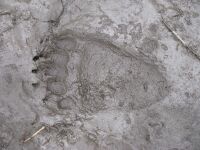 أقدام الدب البني ضخمة للغاية. وُجد أن الأقدام الخلفية للدببة البالغة يبلغ طولها عادةً 21-36 سم، بينما تميل الأقدام الأمامية إلى طول أقل بحوالي 40٪. يبلغ عرض أقدام جميع الدببة البنية متوسطة الحجم حوالي 17.5-20 سم. في ذكور الدب الساحلي أو دب كودياك الكبير، قد يصل طول القدم الخلفية إلى 40 سم وعرضها 28.5 سم، في حين أن دببة كودياك كبيرة الحجم يصل طول أقدامها الخلفية إلى 46 سم.[73][74][75]