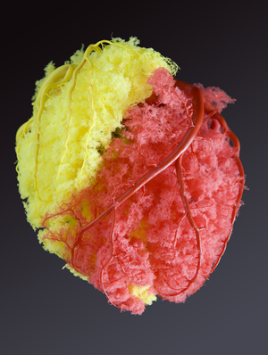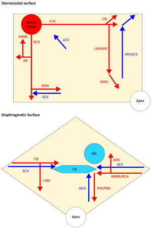 ![]() Blood vessels of the coronary circulation of the human heart viewed from the front and from behind | |