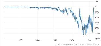 العجز التجاري (الفرق بين الواردات والصادرات) نما من 1 مليار حين تولى أردوغان الحكم في مطلع 2002 إلى 10 مليار دولار في آخر 2015، حين توقفت البنوك الأمريكية عن إقراض تركيا بفائدة شبه صفرية (التسهيل الكمي) مما أدى لانهيار الليرة.