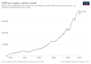 نعمت تركيا بسنوات من النمو الملفت في عهد حزب العدالة والتنمية. ففي عام 2002 كان متوسط نصيب الفرد من الناتج المحلي الإجمالي 3600 دولار وهو ما كان يضع تركيا قبل غينيا الاستوائية مباشرة. وبحلول عام 2013 زاد لثلاثة أمثاله مسجلا 11 ألف دولار لتتقدم تركيا على ماليزيا. وبعد أن تجاوز حجم الناتج السنوي 800 مليار دولار تقف تركيا الآن بارتياح في مصاف أقوى 20 اقتصادا في العالم.