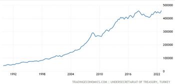 ارتفع الدين الخارجي للدولة من 129 مليار دولار (في الربع الرابع من 2001) إلى 336 مليار دولار (الربع الرابع من 2012).[33] وقـُدِّر بلغ الدين الخارجي لتركيا في الربع الثالث من 2013 بقيمة 372.7 مليار دولار.