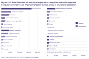 في عام 2019، ذكرت منظمة الويبو (WIPO) أن الذكاء الاصطناعي كان التكنولوجيا الناشئة الأكثر إنتاجية من حيث عدد طلبات البراءات والبراءات الممنوحة، حيث تم تقدير أن شبكة الأشياء (إنترنت الأشياء) هي الأكبر من حيث حجم السوق. وتلتها، مرة أخرى من حيث حجم السوق، تقنيات البيانات الكبيرة، والروبوتات، والذكاء الاصطناعي، والطباعة ثلاثية الأبعاد، والجيل الخامس من خدمات المحمول (5G).[158] منذ ظهور الذكاء الاصطناعي في الخمسينات، تم تقديم 340,000 طلب براءة اختراع متعلقة بالذكاء الاصطناعي من قبل المبتكرين، وتم نشر 1.6 مليون ورقة بحثية من قبل الباحثين، مع تغلب معظم طلبات البراءات المتعلقة بالذكاء الاصطناعي على النشر منذ عام 2013. تمثل الشركات 26 من أصل 30 متقدمًا لطلبات براءات الاختراع المتعلقة بالذكاء الاصطناعي، في حين تتحمل الجامعات أو المنظمات العامة للبحوث الأربعة المتبقية.[159] لقد انخفضت نسبة الأوراق البحثية إلى الاختراعات بشكل كبير من 8:1 في عام 2010 إلى 3:1 في عام 2016، ويعزى ذلك إلى تحول من البحوث النظرية إلى استخدام تقنيات الذكاء الاصطناعي في المنتجات والخدمات التجارية. تعد تقنية التعلم الآلي هي التقنية السائدة في الاختراعات المتعلقة بالذكاء الاصطناعي وتشمل أكثر من ثلث الاختراعات المحددة (134,777 براءة اختراع لتقنية التعلم الآلي من أصل 167,038 براءة اختراع مقدمة لتقنيات الذكاء الاصطناعي في عام 2016)، ويعد تطبيق الرؤية الحاسوبية هو التطبيق الوظيفي الأكثر شيوعاً. تكشف براءات الاختراع المتعلقة بالذكاء الاصطناعي ليس فقط عن تقنيات الذكاء الاصطناعي وتطبيقاتها، بل غالبًا ما تشير أيضًا إلى مجال التطبيق أو الصناعة. تم تحديد عشرين مجالًا للتطبيق في عام 2016، وشملت على التوالي: الاتصالات (15 في المائة)، والنقل (15 في المائة)، والعلوم الحياتية والطبية (12 في المائة)، والأجهزة الشخصية والحوسبة والتفاعل بين الإنسان والحاسوب (11 في المائة). وتضمنت القطاعات الأخرى البنوك والترفيه والأمن والصناعة والتصنيع والزراعة والشبكات (بما في ذلك الشبكات الاجتماعية والمدن الذكية وإنترنت الأشياء). تمتلك شركة IBM أكبر محفظة براءات اختراع الذكاء الاصطناعي بـ 8,290 تقدماً لبراءات الاختراع، تليها شركة مايكروسوفت مع 5930 طلب براءة اختراع.[159]