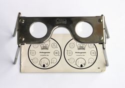 Pocket stereoscope with original test image. Used by military to examine stereoscopic pairs of aerial photographs.