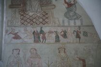 In Denmark, old ballads mention a closed circle dance which can open into a chain dance. A fresco in Ørslev church in Zealand from about 1400 shows nine people, men and women, dancing in a line. The leader and some others in the chain carry bouquets of flowers. In the case of women's dances, there may have been a man who acted as the leader.[20][21] In Sweden, medieval songs often mentioned dancing. A long chain was formed, with the leader singing the verses and setting the time while the other dancers joined in the chorus.[22]
