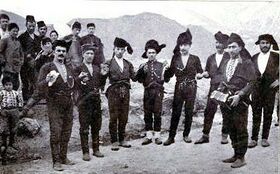 Kochari is an Armenian[41][42][43] folk dance, danced today by Armenians, Assyrians,[44] Azerbaijanis, Kurds, Pontic Greeks[45] and Turks.[46] Dancers form a closed circle, putting their hands on each other's shoulders. More modern forms of Kochari have added a "tremolo step," which involves shaking the whole body. In Azerbaijan, the dance consists of slow and rapid parts, and is of three variants. There is a consistent, strong double bounce. Pontic Greeks dance hand-to-shoulder and travel to the right.[47][48]