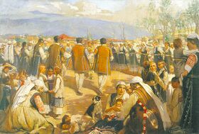 In Macedonia, near the town of Zletovo, the murals on the monastery of Lesnovo (Lesnovo Manastir), which date from the 14th century, show a group of young men linking arms in a round dance.[8] A chronicle from 1344 urges the people of the city of Zadar to sing and dance circle dances for a festival. However, a reference comes from Bulgaria, in a manuscript of a 14th-century sermon, which called chain dances "devilish and damned."[9]