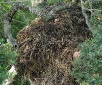تعتبر تلك الطيور بناءة أعشاش قاهرة القوة، حيث تبني من 3 إلى 5 أعشاش في العام سواء تكاثرت أم لم تتكاثر. ويجبر كل من البومة المصاصة وبعفة تلك الطيور على ترك أعشاشها وتقوم بأخذها، ولكن بعد ترك البوم للأعشاش من الممكن أن تعود الطيور مطرقية الرؤوس لاستخدامها.[2] تعيش الثعابين، والثدييات الصغيرة كـالرباح، والعديد من الطيور المختلفة في أعشاش مهجورة، وقد توصل الحباك، وطائر الزرزور الكبير، والحمام أعشاشها بالخارج.[4]