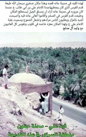 مقام قبة علي في مدينة عانة القديمة وهو مقام منسوب للامام علي بن أبي طالب عليه السلام في منطقة حقون او السراي في عانة القديمة وفي اعلى الجبل المطل على المنطقة يوجد مزار يعتقد اهالي عانة انه اثر قدم فرس امير المؤمنين علي بن ابي طالب منه السلام ويزوره أهالي عانة ومنطقة حقون حيث كان يسكن تلك المنطقة الاقلية من الطائفة العلوية النصيرية في العراق وهذا المكان ابرز الاماكن التي كانت لها مكانة عندهم وهناك مقام اخر لامير المؤمنين في عانة يسمى مشهد الحجر في اطراف عانة.
