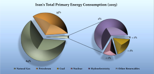 وصلت طاقة توليد الطاقة لمحطات الطاقة الحرارية الإيرانية إلى 173 تيراواط ساعة في عام 2007، وهو ما يمثل 17.9 في المائة من إنتاج الطاقة في منطقة الشرق الأوسط وإفريقيا. كان الغاز الطبيعي هو الطاقة الرئيسية في إيران في عام 2007، ويشكل أكثر من 55 في المائة من احتياجات الطاقة، في حين أن النفط والطاقة الكهرومائية يمثلان 42 و2 في المائة على التوالي. سوف تزداد حاجة المنطقة من الطاقة بنسبة 26.8 في المائة حتى عام 2012.[15] في عام 2017، كان استهلاك الوقود في إيران يعادل 5.5 مليون برميل من الوقود يومياً، ويعتبر معدل استهلاكها أعلى معدل استهلاك للطاقة في العالم من حيث كثافة الطاقة.[16]