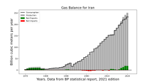 إيران هي ثالث منتج في العالم لـ الغاز الطبيعي (5.1٪ من الإجمالي العالمي و184 مليار متر مكعب); والتي تستخدم بشكل أساسي لتوليد الكهرباء المحلية أو إنتاج الحرارة.[21] يحتوي على ما يقدر بـ 1،187.3 trillion أقدام مكعبة (33،620 km3) (Tcf) في احتياطيات الغاز الطبيعي المؤكدة.[2] في عام 2005، كان يُعتقد أن حصة كبيرة من احتياطيات الغاز الطبيعي الإيرانية لم تُستغل. حوالي 62٪ من هذه الاحتياطيات موجودة في حقول غير مرتبطة. من المتوقع أن يزداد إنتاج إيران من الغاز الطبيعي خلال السنوات القليلة القادمة بسبب استمرار الاكتشافات في حقل فارس الشمالي للغاز وحقل جنوب فارس / الشمال للغاز والمكثفات.[22]