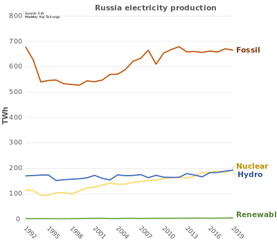 تعد روسيا رابع أكبر منتج للكهرباء في العالم بعد الصين والولايات المتحدة والهند. وفي عام 2020، أنتجت روسيا 1085 تيراواط ساعي[54]وتصدر 20 تيراواط ساعي من الكهرباء.[55] تولد ما يقارب من 60٪ من الكهرباء في روسيا من الوقود الأحفوري، و 20٪ من الطاقة الكهرباء مائية، و 20٪ من المفاعل نووي.[54]ويعد توليد الطاقة المتجددة ضئيل.
