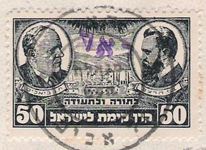 In early May 1948, the Jewish provisional government, known as Minhelet Ha'am, did not have its own postage stamps ready, so it used existing labels,[100] both JNF labels, which otherwise have been printed since 1902 for fundraising purposes,[101] and local community tax stamps. The JNF labels were given a Hebrew overprint meaning postage (doar),[102] (as shown in the picture), whereas local community tax stamps were not given overprints.[103] The JNF stamps were printed from May 3 to 14, 1948,[بحاجة لمصدر] their sale ended on May 14, 1948, with remaining stocks ordered to be returned and destroyed.[104] Use of these stamps was tolerated until May 22, 1948.[104] The Mandate's postal rates remained unchanged during this period.[105]