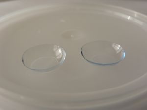 العدسات اللاصقة عادة ما تخدم نفس هدف النظارات الطبية ، ولكنها خفيفة وغير مرئية - اغلب العدسات التجارية تكون مظللة بالازرق الفاتح الشفاف لكي يجعلوها اكثر مرئية عندما يتم غمسها في محاليل التنظيف والخزن. العدسات التجميلية تكون ملونة عن قصد لتغيير شكل العين.