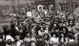 Mary Macarthur addressing the crowds during the chain makers' strike, Cradley Heath, 1910