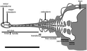 وقد كانت هراوة ذيل الأنكيلوصور الشهيرة كذلك تتألف من العديد من الجلود العظمية الضخمة التي كانت تلتحم بـفقرة الذيل. كما كانت ثقيلة ومدعّمة بآخر سبع فقراتٍ في الذيل التي تشابكت مُكَونةً قضيبًا قويًا في قاعدة الهراوة. وبالنسبةِ إلى الأوتار المتصلة بتلك الفقرات، فقد تم حِفظها. وقد كانت هذه الأوتار متحجّرة (أو عظمية) بشكلٍ جزئي ولم تكن مرنة للغاية، مما يسمح بانتقال قوة كبيرة إلى نهاية الذيل حين يتأرجح. ويتضح أنها كانت سلاحًا دفاعيًا فعّالاً قادرًا على إحداث أثر مدمِّر يكفي لكسر عظام المهاجم.[2] أظهرت دراسة في عام 2009 أن" نتوءات الذيل كبيرة الحجم قادرة على إحداث قوة كافية لكسر العظام أثناء التصادمات، بينما لا تقوى النتوءات الصغيرة والمتوسطة على إحداث ذلك"، وأن "سلوك أرجحة الذيل محتمل حدوثه عند ديناصورات الأنكايلوصوريدس (ankylosaurids) ولكنه لا يزال غير معروف ما إذا كانت تستخدمه كوسيلةٍ لدفاع داخلي معين أو لصراع خارجي محدد أو لكليهما".[3] وجرى الافتراض بأن هراوة الذيل كانت تستخدم كشركٍ للرأس ولكن هذه الفكرة فقدت مصداقيتها الآن إلى حدٍ كبير.[4]