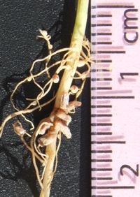 العقد الجذرية Root nodules، تحدث على جذور النباتات (وبصفة أساسية البقولية) وتترافق مع بكتريا تثبيت النيتروجين التكافلية. في ظل الظروف التي تحد من النيتروجين، تشكل النباتات القادرة علاقة تكافلية مع سلالة معينة من البكتريا تعرف بالريزوبيا.[1] تطورت هذه العملية عدة مرات داخل الفصيلة البقولية، فضلاً عن أنواع أخرى ضمن صُفيف الورديات.[2] تشمل الفصيلة البقولية حاصلات البقوليات مثل الفاصولياء والبازلاء.