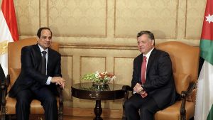 - 13 يناير 2019: قام الرئيس السيسي بزيارة الأردن حيث التقى بالملك عبد الله الثاني، في إطار التشاور والتنسيق الدوري بين البلدين. تناولت مباحثات الرئيس السيسى والملك عبد الله الثاني، تطورات الأوضاع والقضايا الإقليمية، وعلى رأسها الأوضاع في الأراضي الفلسطينية، فضلاً عن بحث الجهود الرامية للتوصل لتسويات سياسية للأزمات القائمة، بما يُساهم في استعادة الأمن والاستقرار لشعوب المنطقة.[54]
