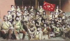 مجموعة فدائيين تقاتل تحت راية الاتحاد الثوري الأرمني. النص بالأرمنية يقول "أزادوتيون گم ماه" (الحرية أو الموت).