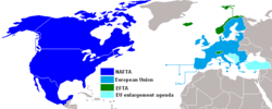 مُقترح إنشاء منطقة التجارة الحرة عبر الأطلسي بين الولايات المتحدة والاتحاد الاوروپي. Map shows potential other membes: NAFTA, EFTA and future EU members.