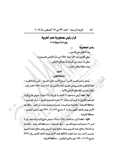في 2017، صدر قرار جمهوري، بتخصيص قطعتي أرض لأمير الكويت صباح الأحمد الصباح، واعتبارها تحت السيادة الكويتية. القطعة الأولى بمساحة 6 أفدنة تقريباً في قصاصين الشرق، مركز الحسينية، محافظة الشرقية، بالإضافة لقطعة أرض أخرى بنفس المنطقة مساحتها 128 فدان. ثم اتضح أن المأخذ الثالث لترعة السلام يقع في تلك الأرض التي خرجت عن السيادة المصرية.[1]