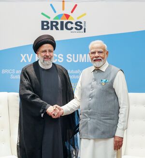 رئيس الوزراء الهندي نارندرا مودي والرئيس الإيراني إبراهيم رئيسي أثناء قمة البريكس رقم 15 في جوهانسبورگ، جنوب أفريقيا، 24 أغسطس 2023.