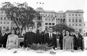 زيارة رسمية هندية إلى القاهرة: على مائدة افطار رمضاني، أمام قصر القبة بالقاهرة، يونيو 1985. إلى اليسار يقف رئيس الوزراء كمال حسن علي، ثم سوزان مبارك، رئيس وزراء الهند راجيڤ غاندي، الرئيس حسني مبارك، سونيا غاندي، مصطفى خليل.