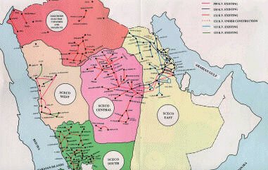 لا يوجد في المملكة حتى الآن أي نظام ربط كهربائي عدا النظامين الكبيرين الموجودين في المنطقة الشرقية والوسطى، حيثُ تَمّ ربطها عند 380 كيلو فولت (380 kV)، أما بقية مناطق المملكة فتتمتعُ بشبكةِ خطوطِ نقل قدرة ذاتية. وعلى أيةِ حال إنّ تشغيل نظمٍ كهربائيةٍ صغيرةٍ من النوع المستقلة - ذاتياً ما يزالُ قيد الاختبار والتجربة في بقاعٍ متعددةٍ من أراضي المملكة. كما يجري حالياً مناقشة الربط الكهربائي مع الدول الخليجية. أمّا ما يتعلق بجهد خطوط النقل فهي كالتالي: 380، 230، 132، 115، 110 كيلو فولت. يبلغ الطول الكلي لخطوطِ نقلِ القدرة الكهربائية أكثر من 15.000 كيلو متر، أما تشغيل شبكات توزيع الجهد العالي فتعملُ عند 69 و 34.5 و 33 و 13.8 كيلو فولت، وتصلُ الكهرباء إلى المستخدمين في المنازلِ عند الجهود 380، 220، 127 فولت.