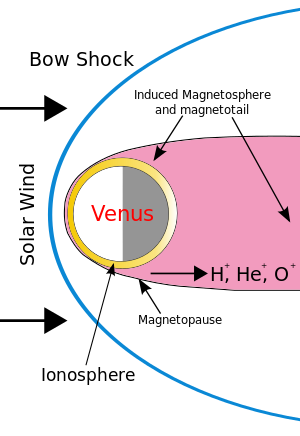 على عكس الأرض لا يمتلك كوكب الزهرة مجالاً مغناطيسياً. إذ يفصل أيونوسفيره غلافه الجويّ عن الفضاء الخارجي والرياح الشمسية، وتٌسمَّى هذه الطبقة المتأينة من الغلاف الجوي المجال المغناطيسيّ الشمسيّ، مما يمنح الزهرة بيئة مغناطيسيَّة مميزة. ويعتبر هذا غلاف الزهرة المغناطيسي الضمنيّ. وتستمرّ الرياح الشمسية بفصل الغازات الخفيفة مثل بخار الماء عن الغلاف الجوي وقذفها إلى الفضاء الخارجيّ، مكوّنة أيضاً ما يعرف بـ"الذيل المغناطيسي الضمني".[4] يتكهَّن البعض بأن غلاف الزهرة الجوي كان قبل 4 بلايين سنة شبيهاً جداً بغلاف الأرض الجوي، مع وجود ماء سائل على سطحه. غير أن ظاهرة البيت الزجاجي ربما تسبَّبت بتبخر المياه على سطح الكوكب وزيادة كميات الغازات الدفيئة في الجو بشكل كبير.[8][9]