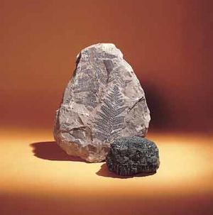 أحفورة نبات سرخسي مع قطعة من الفحم الحجري، تكونت كلتاهما من بقايا النباتات التي ماتت قبل عدة ملايين من السنين. اختزنت النباتات خلال فترة حياتها طاقة استمدتها من الشمس. وتخلت النباتات التي أصبحت أحافير عن طاقتها المختزنة أثناء عملية التأحفر، وبقيت الخطوط العريضة التي تدل على مظهرها العام. ولكن طاقة النباتات المكونة للفحم في الفحم الحجري، تتحرر على هيئة حرارة عندما يحترق الفحم الحجري.